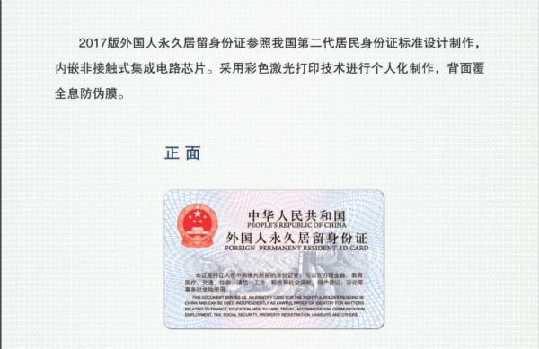 5月27日,公安部公告將于2017年6月16日起簽發(fā)2017版外國人永久居留身份證。同時(shí)停止簽發(fā)現(xiàn)行外國人永久居留證。永久居留身份證是外國人在我國境內(nèi)證明自己身份的合法證件,是永久居留外國人享受在華資格待遇的有效憑證,可以使用第二代居民身份證閱讀機(jī)具讀取。屆時(shí),永久居留身份證的實(shí)用效能將大幅提升,新增的機(jī)讀核驗(yàn)功能也將進(jìn)一步便利持證人在華工作和生活,為永久居留外國人提供良好的社會(huì)服務(wù),切實(shí)增強(qiáng)永久居留外國人的獲得感。